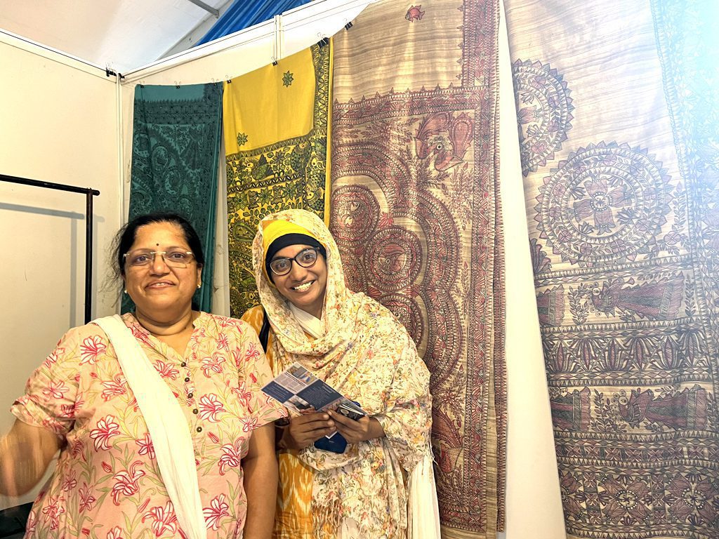 The heart of her stall was an array of textiles that bore the labor of love and the magic of Mithila art. Sarees adorned with intricate motifs and vibrant hues caught the eye of every passerby. Each piece was not just a cloth; it was a canvas that narrated stories of cultural heritage and artistic mastery. Stoles and dupattas, delicately painted, added a touch of elegance to everyday wear, while also weaving tales of tradition into modern fashion.