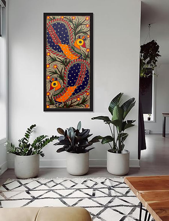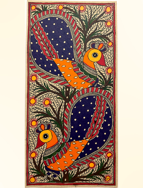 This exquisite Madhubani painting features two majestic peacocks positioned on either side of a tree of life with blooming pink flowers. The richly detailed background with countless fine leaves creates a perfect setting for these auspicious birds, symbolizing beauty and immortality.