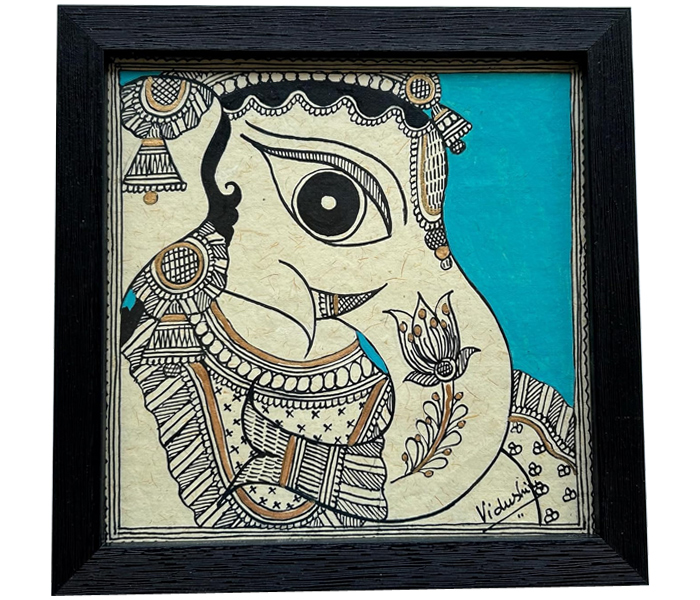 This exquisite Madhubani painting beautifully captures Lord Ganesha’s divine presence with intricate traditional patterns and motifs. Rendered in bold black lines with delicate earth tones and a serene turquoise background, the artwork reflects the spiritual symbolism and folk artistry of Bihar. The floral motif on Ganesha’s trunk adds a touch of nature’s blessing, embodying prosperity and wisdom. This piece celebrates the timeless cultural heritage of Madhubani art, fused with the sacred aura of the elephant-headed deity