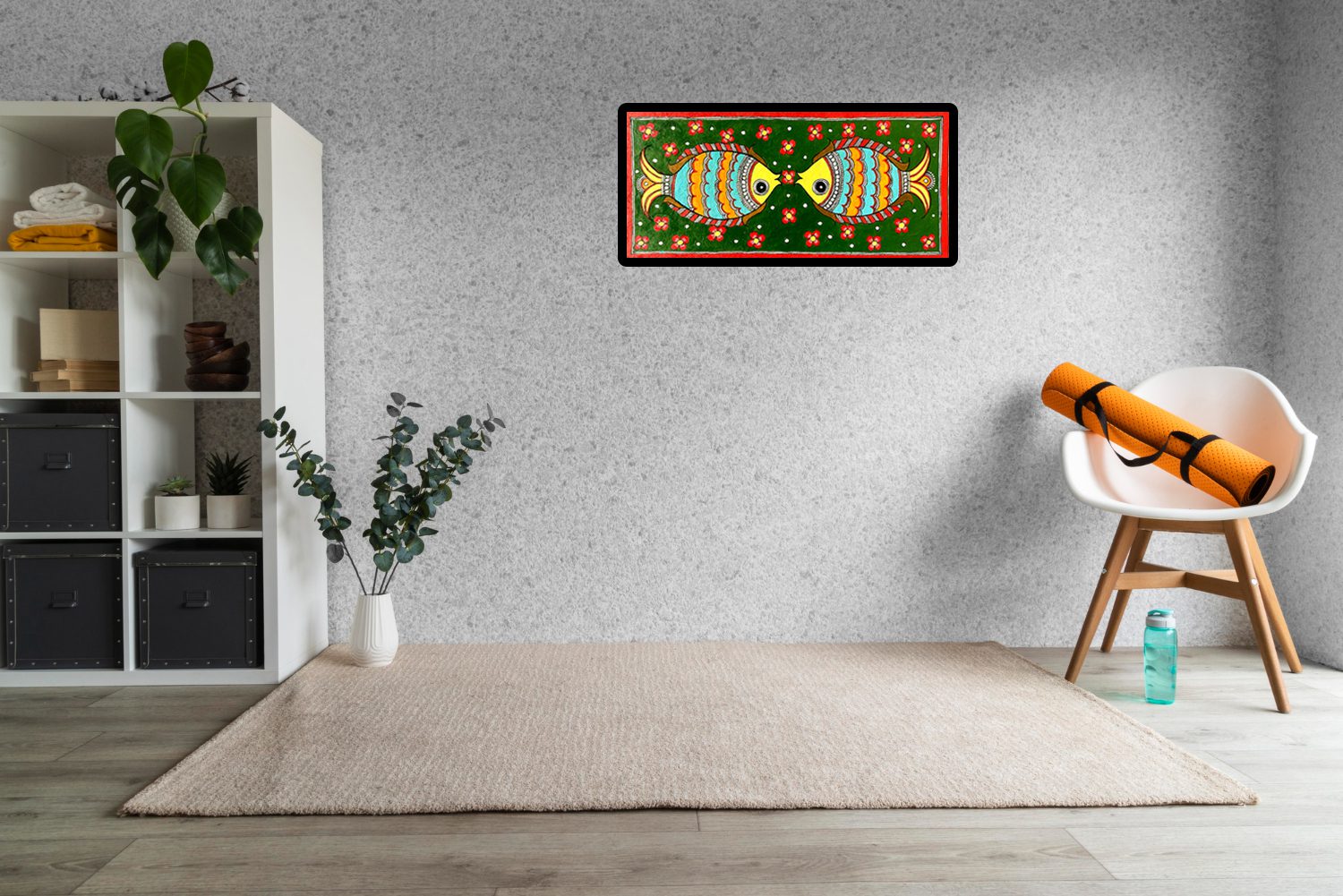 - Mirrored fish composition – one of the most auspicious motifs in Madhubani art